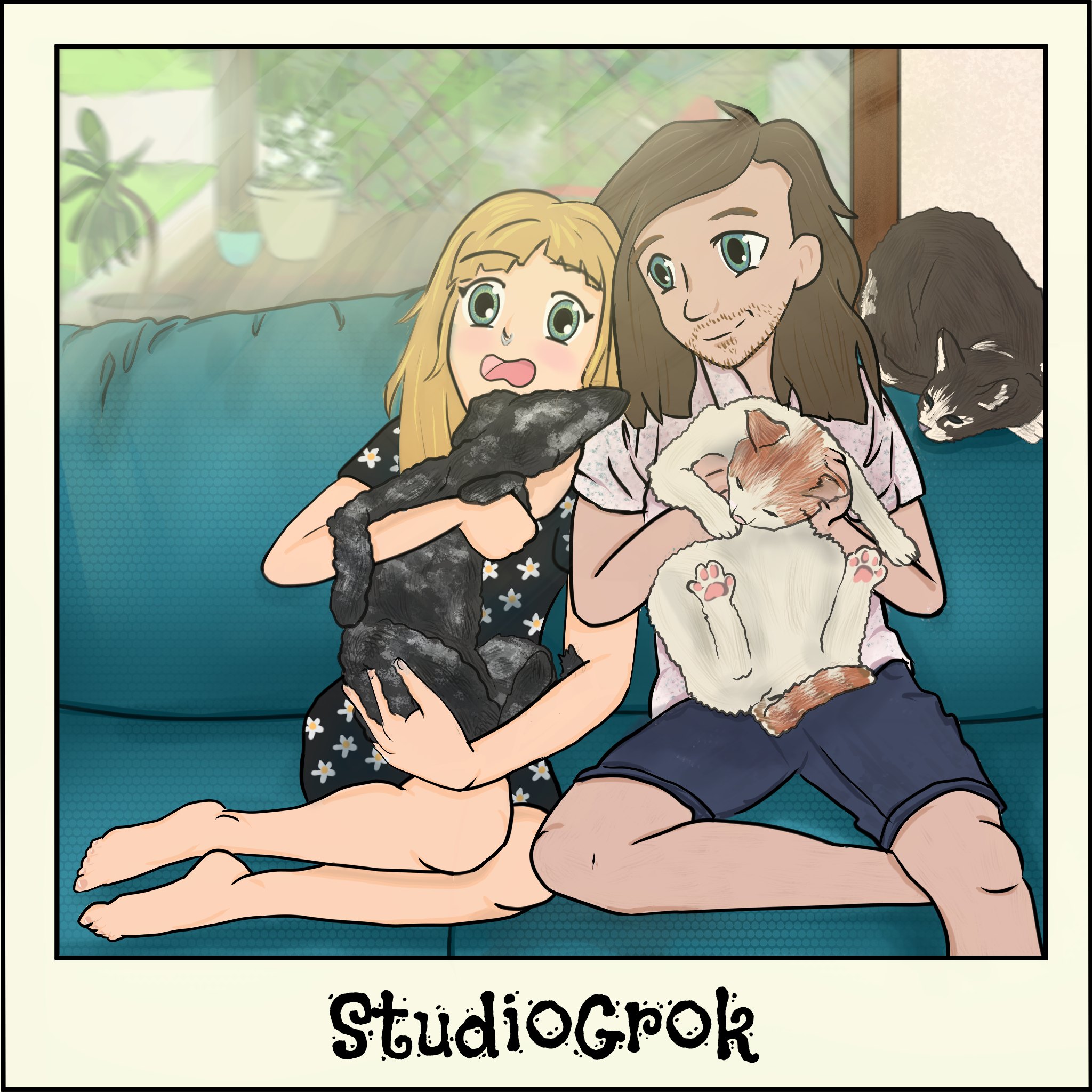 Husband and wife anime lovers and game developers. We have two cats and a dog, but they aren't much help.